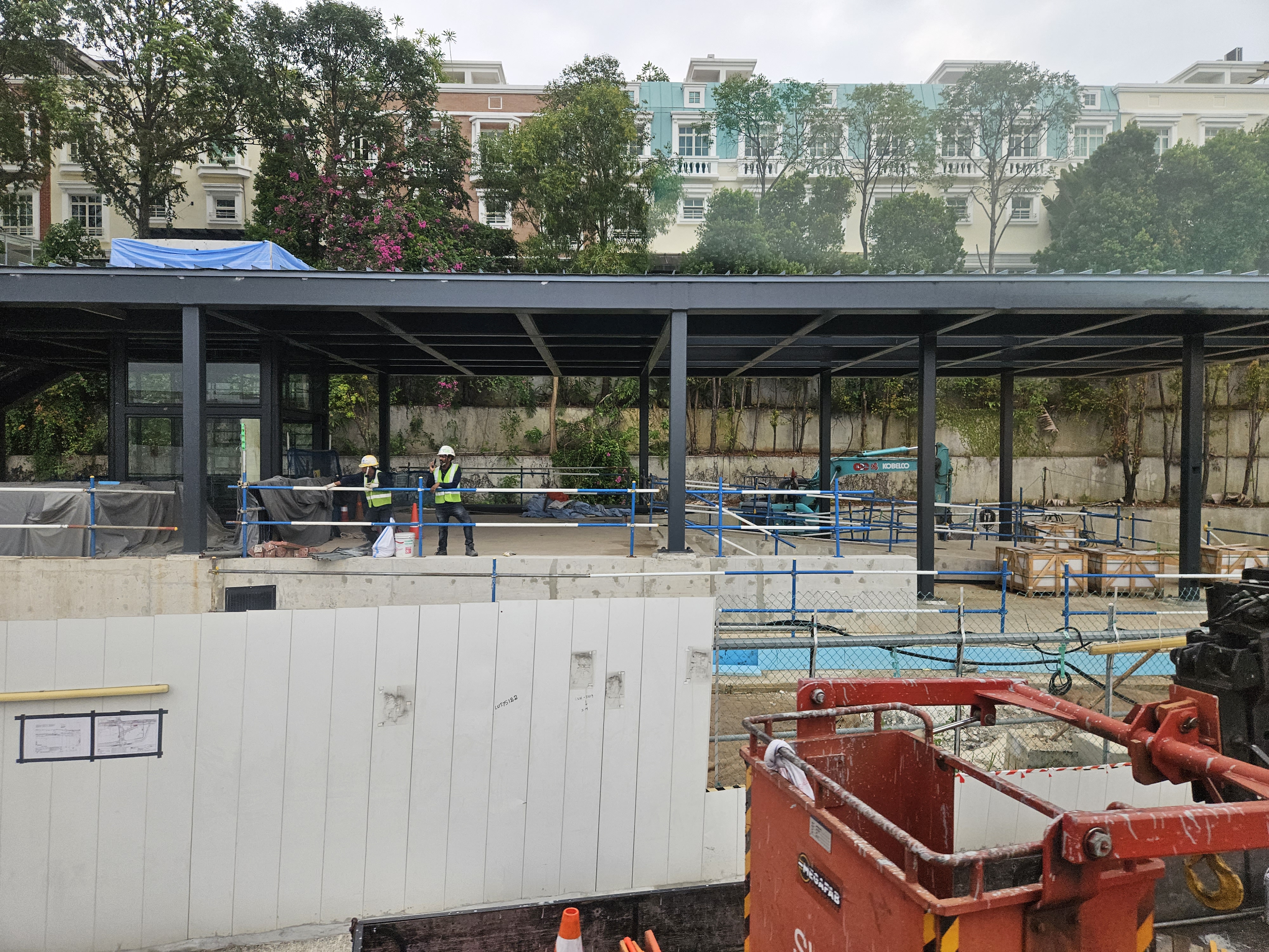 Exit 4Of the 5 exits for the station, this is the exit with the slowest progress, potentially due to its location directly outside Temasek Secondary School. The metal roof frame was only recently installed.
